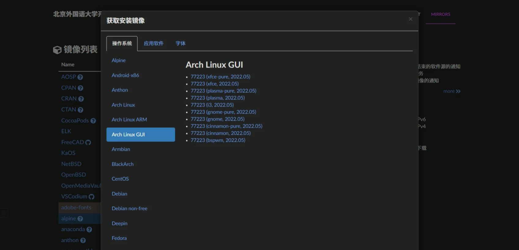 前往北外源,选择 77223 (plasma, 2022.05)(当然可以选自己喜欢的桌面环境或者窗口管理器)。