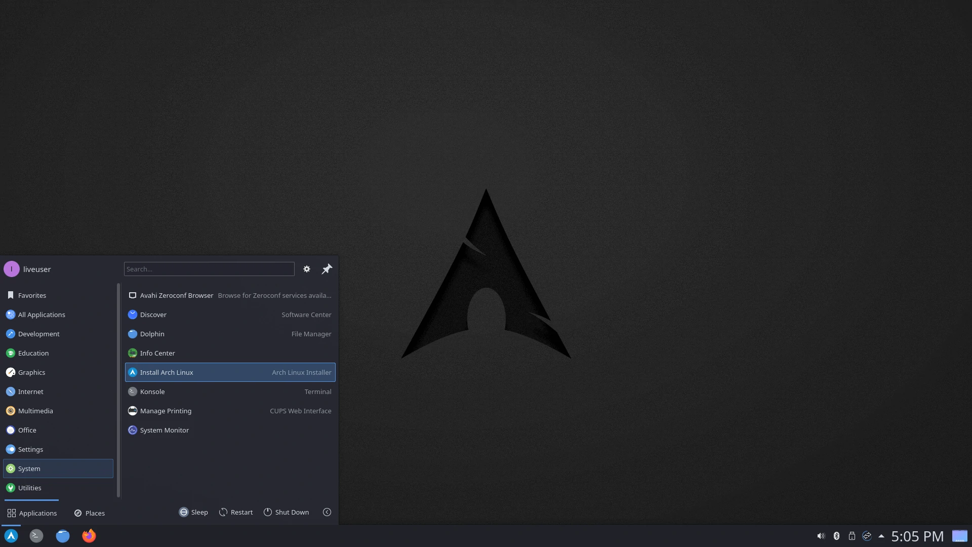 在左下角开始菜单里,点击 Applications > System > Install Arch Linux(在窗口管理器版本需使用快捷键 Win + D 打开 Rofi,搜索 Install Arch Linux),