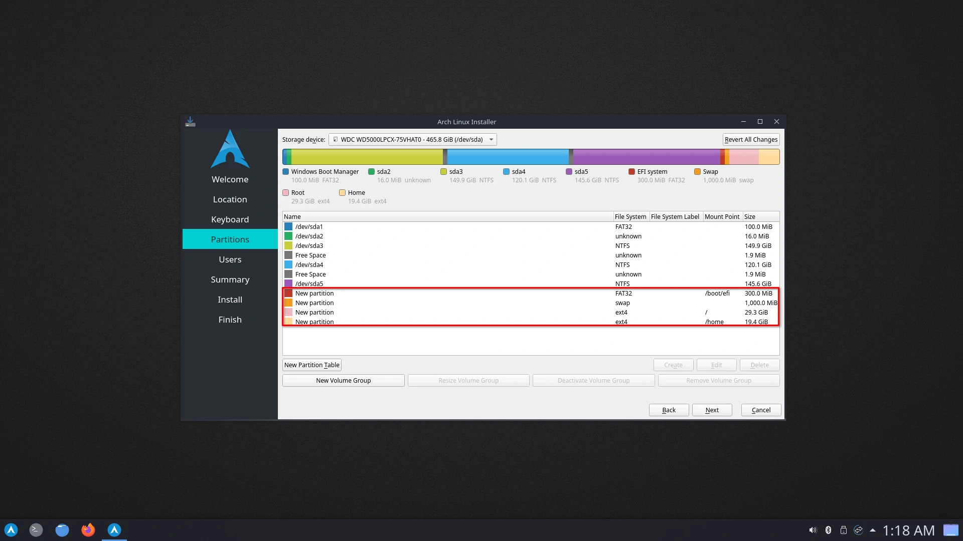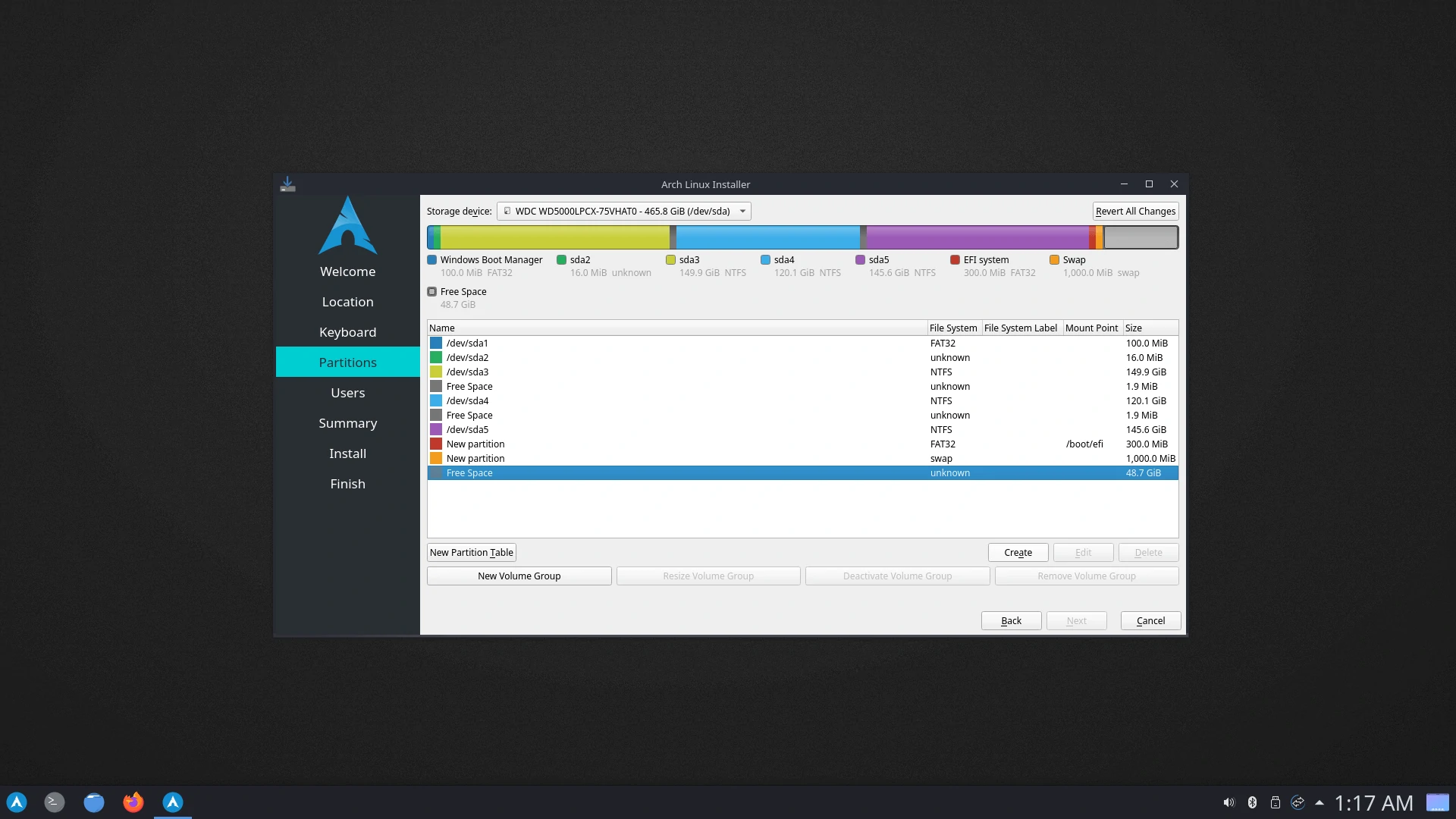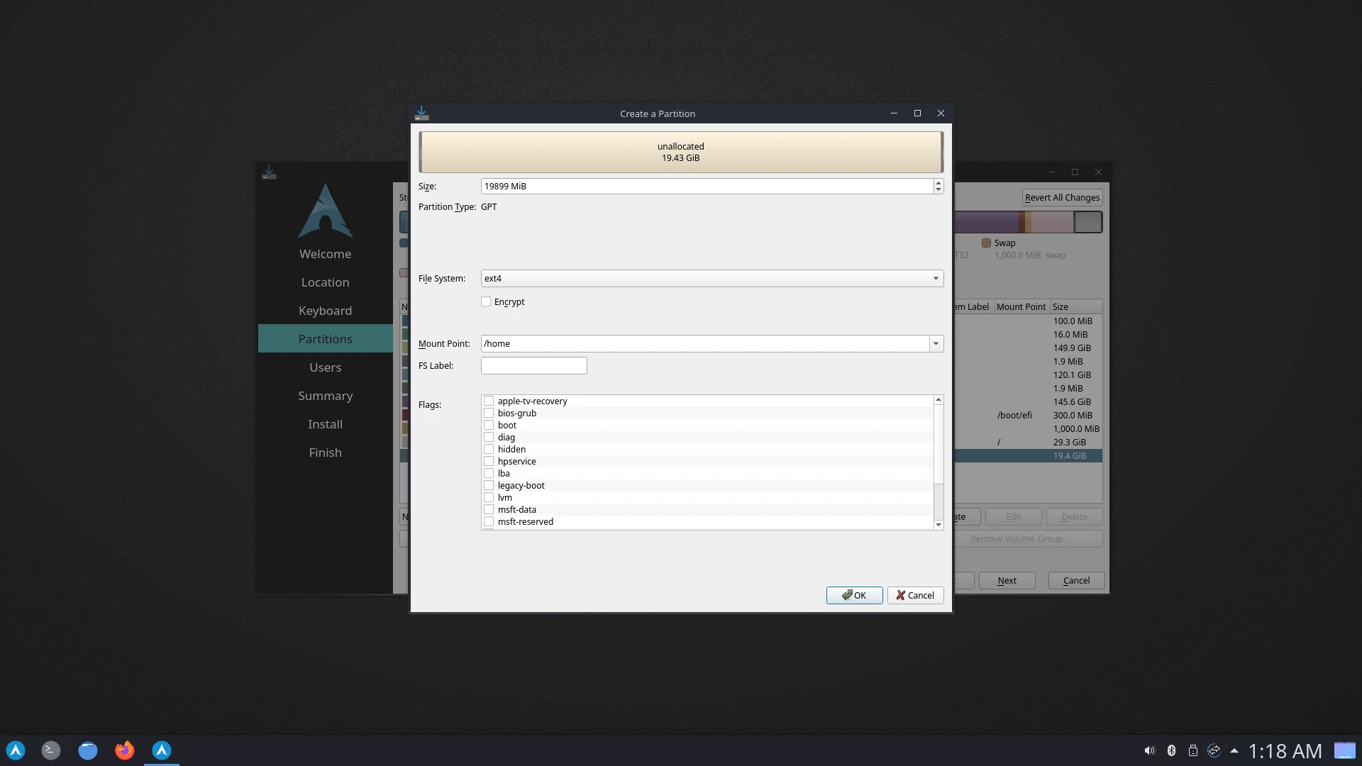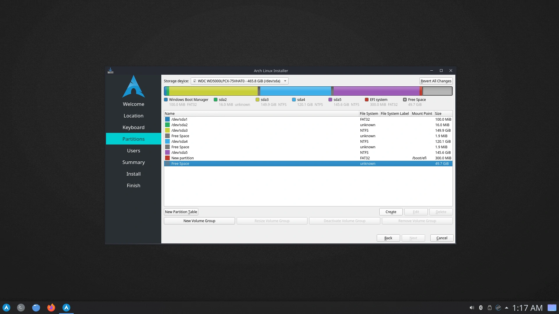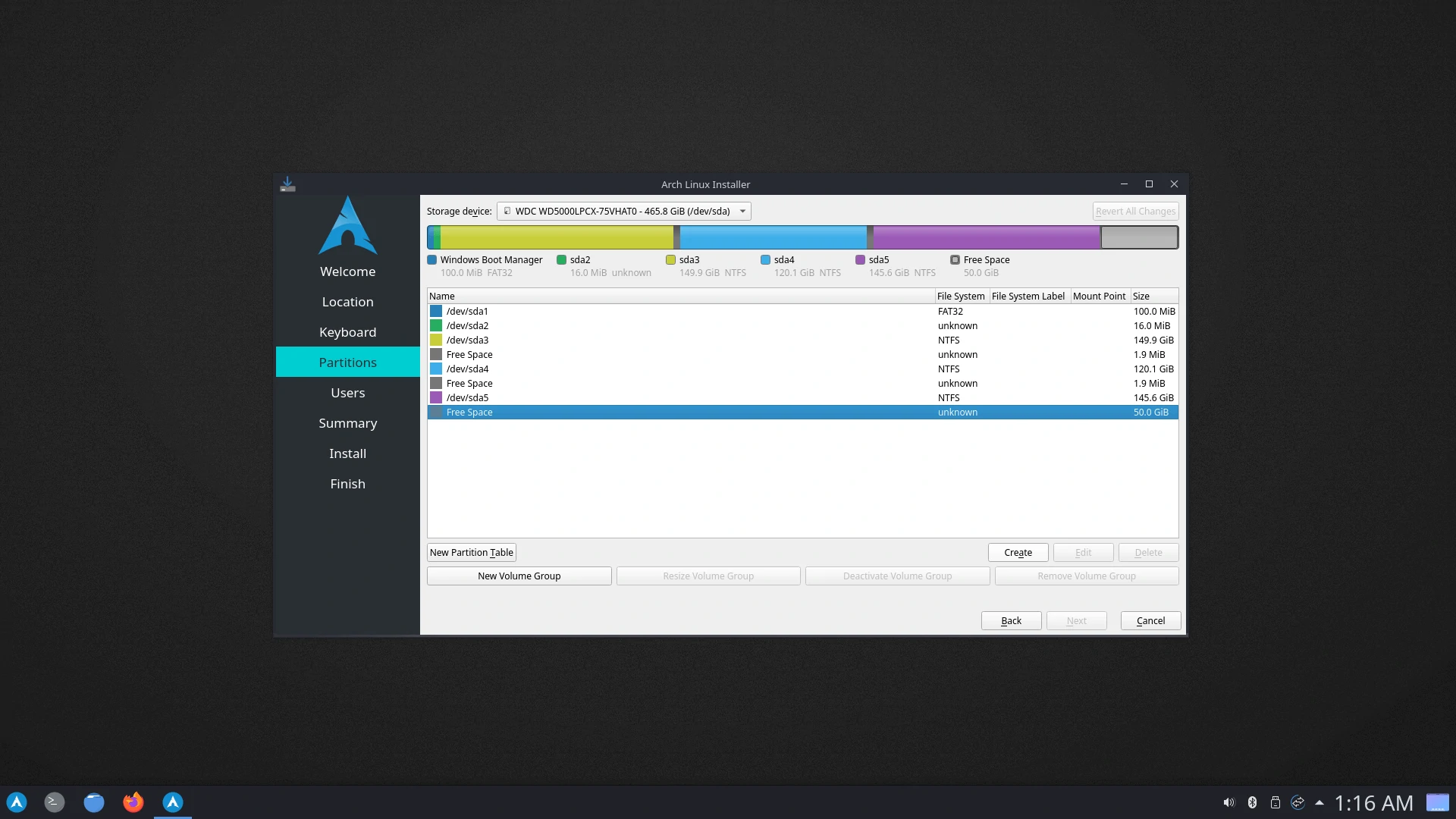 点击下一步,选中最下面分到的 Free Space(这里制作双系统,只给了 50GiB 空间),然后点击右下角 Create