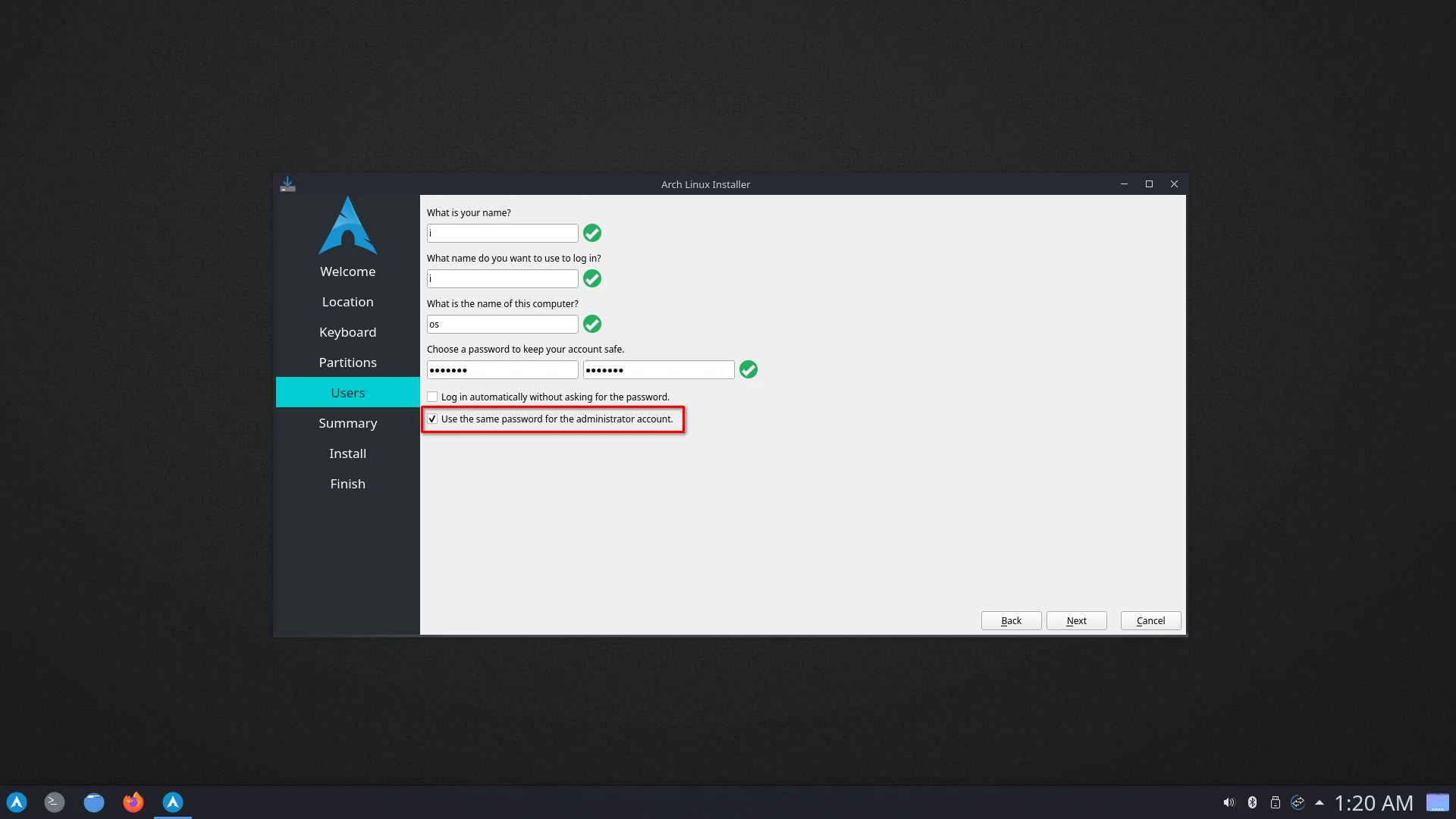 点击下一步,设置用户名、系统名和密码,设置管理员密码与登录用户相同